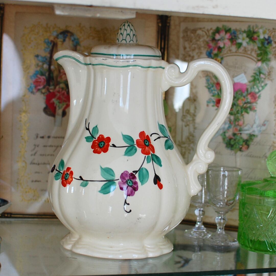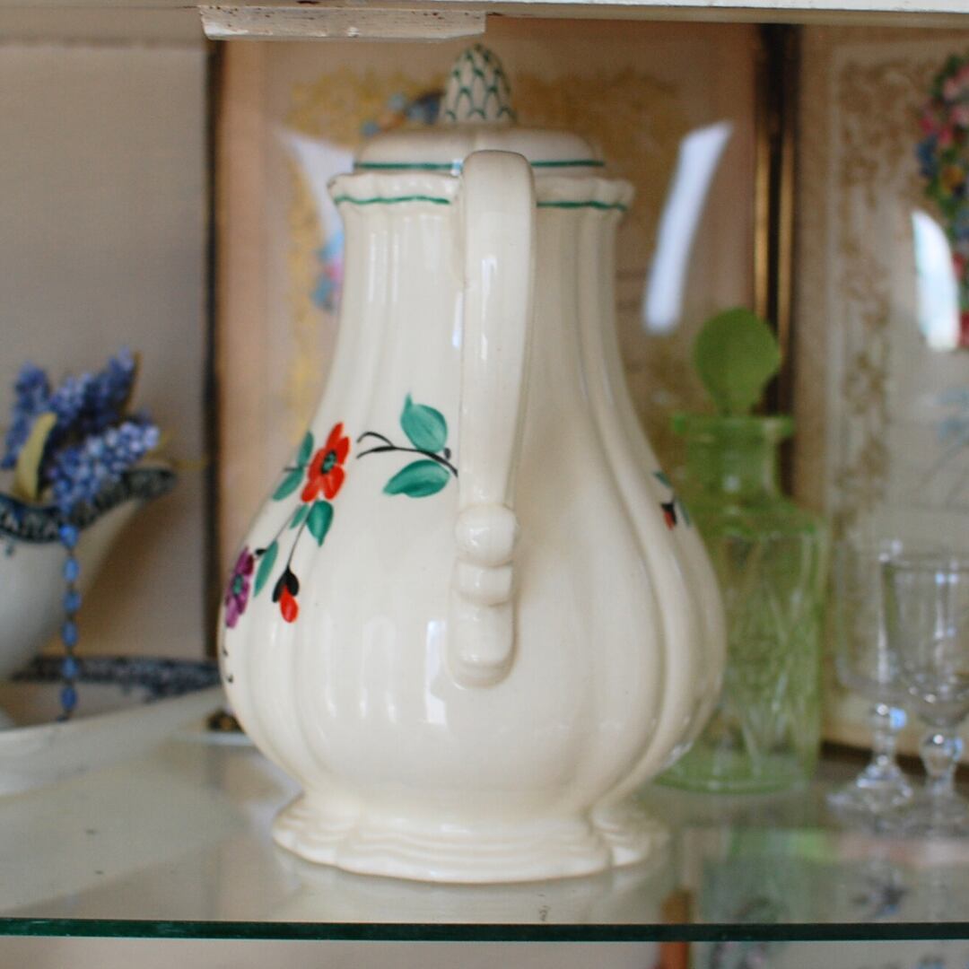 フランスより届きました、サルグミンヌのティーポットです。1910年から1940年ごろのものでアイボリーの陶肌に赤と紫の小花が手描きで描かれた花リムのティーポットです。ふっくらとしたボディーから上にキュッとしまったかたちが絵本の中のポットのようにとても可愛いです。大きめサイズなのでディスプレイなどで飾られても素敵です。