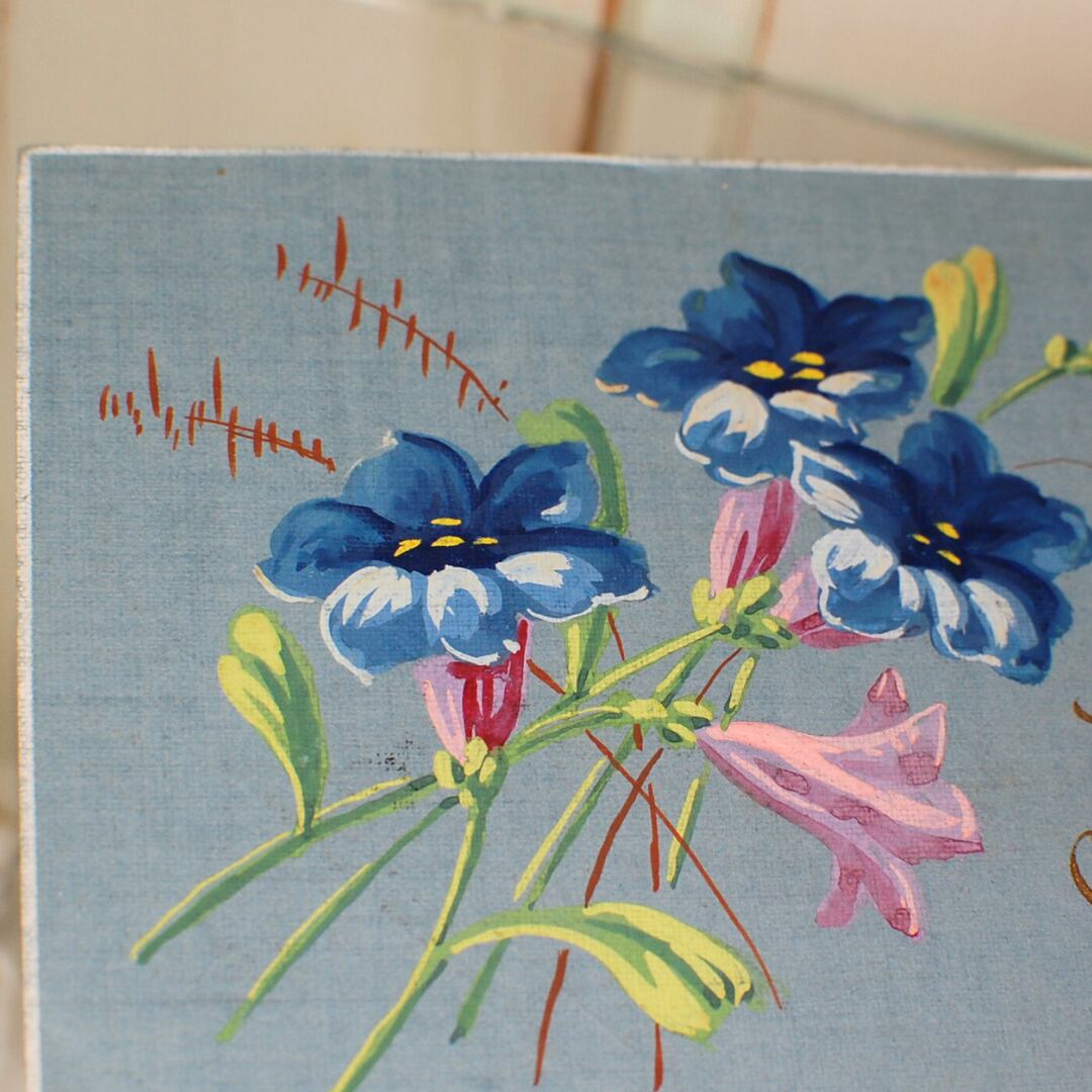 アンティークポストカード フランス ブルーの手描きの花 1909年