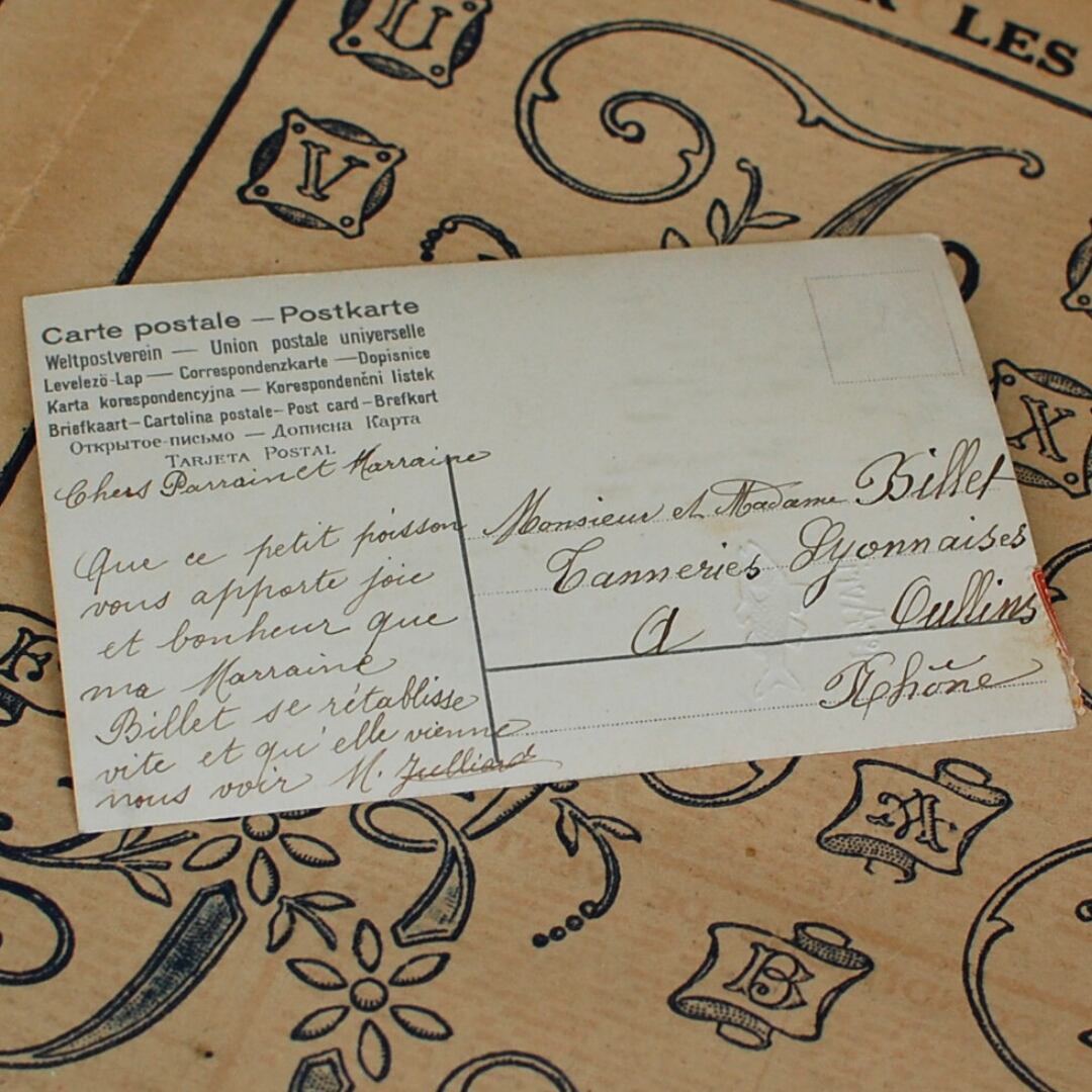 フランスより届きました、光沢のある紙に黒地に濃いピンクのカーネーションがアレンジされたバスケットと魚の装飾が入ったアンティークポストカードです。切手の刻印は読み取れません。表面にしわが少しございます。