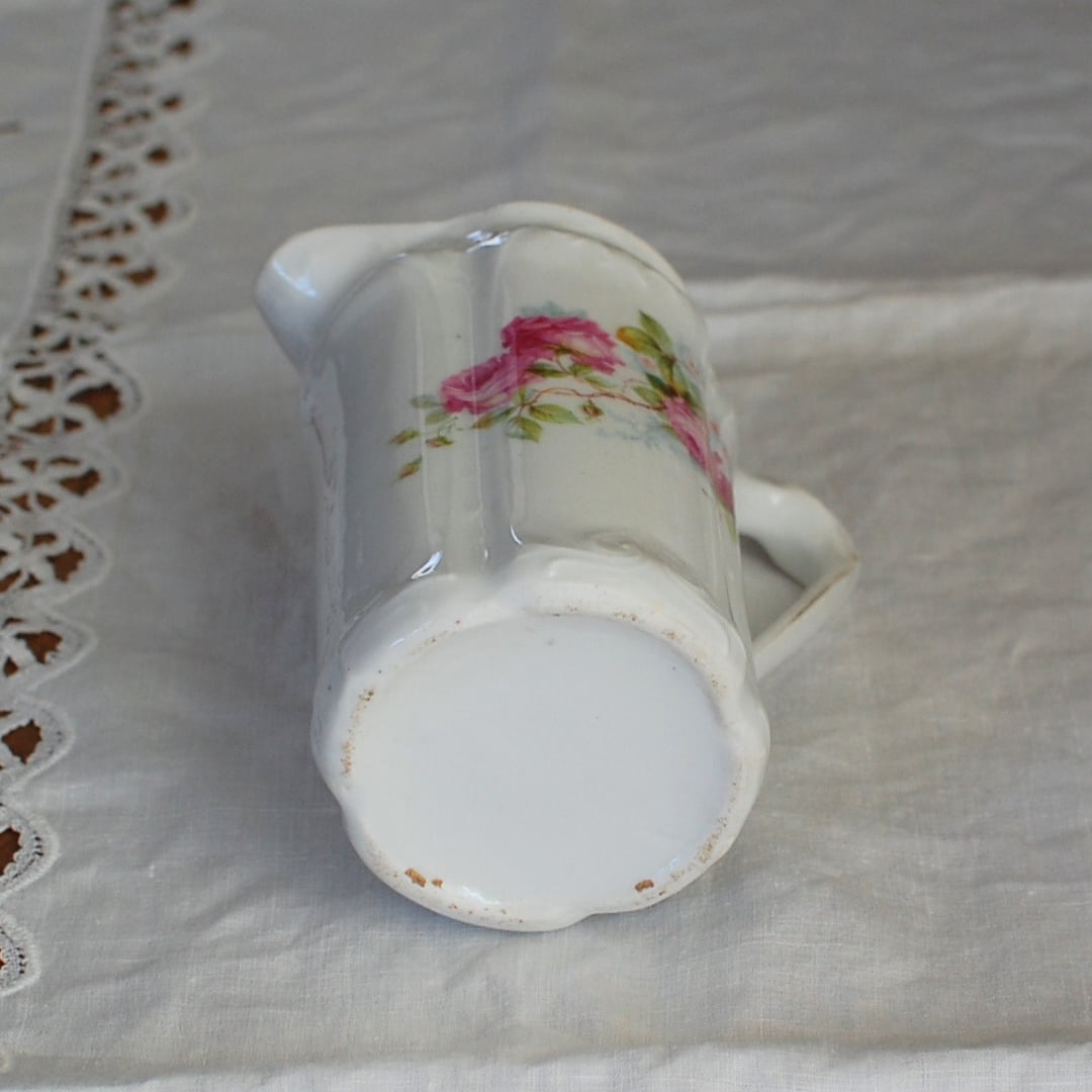 フランスより届きましたローズプリント柄の陶器のピシェ、こちらは高さが12センチで2番目に大きいものです。取っ手のフォルムや本体に入った滑らかな曲線がとても美しいデザインです。