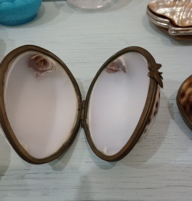 ぷっくりとしたフォルムが可愛い貝のがま口です。口金部分は蝶の装飾がついており真鍮製でパチンと閉まります。ホワイト系の大きなタカラ貝でできており艶があります。中に貝の一部分がそのまま残っております。アクセサリーを入れるのはもちろん、飾っておくだけでもとても可愛いアイテムです。
