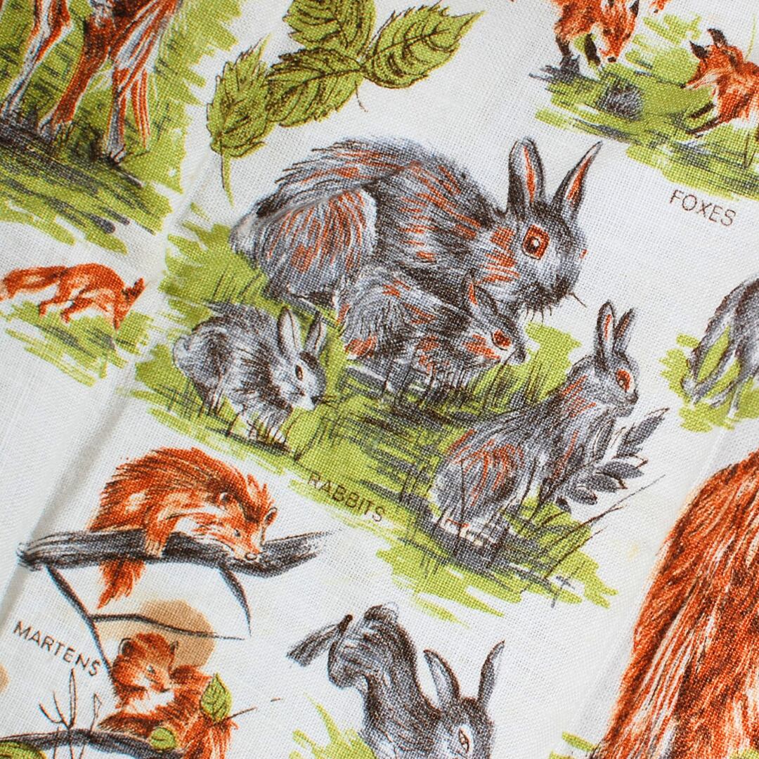 古いアイリッシュリネン ヴィンテージクロス 森の動物 うさぎ リス キツネ シカ スカンク オオカミ シミあり