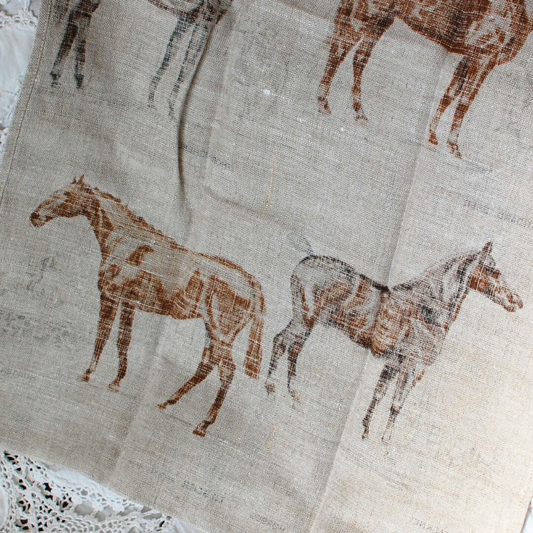 リネン全体に数種類の馬たちが描かれキッチンクロスにはもちろん、バスケットの上の目かくしカバー,や生地としてハンドメイドの材料としてもご利用いただけます。