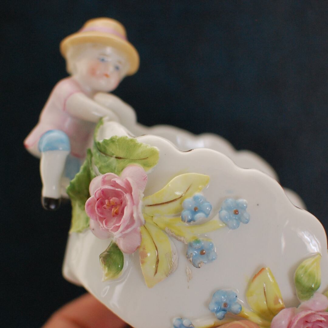 ふっくらと中央が扇形にもりあがった形の両サイドに帽子をかぶった男の子と女の子がつかまっていいて独特な表情をしています。薔薇と忘れな草の装飾は正面のみで、バラの花びらは貝のように薄く欠けが数か所ございます(画像にてご確認ください)