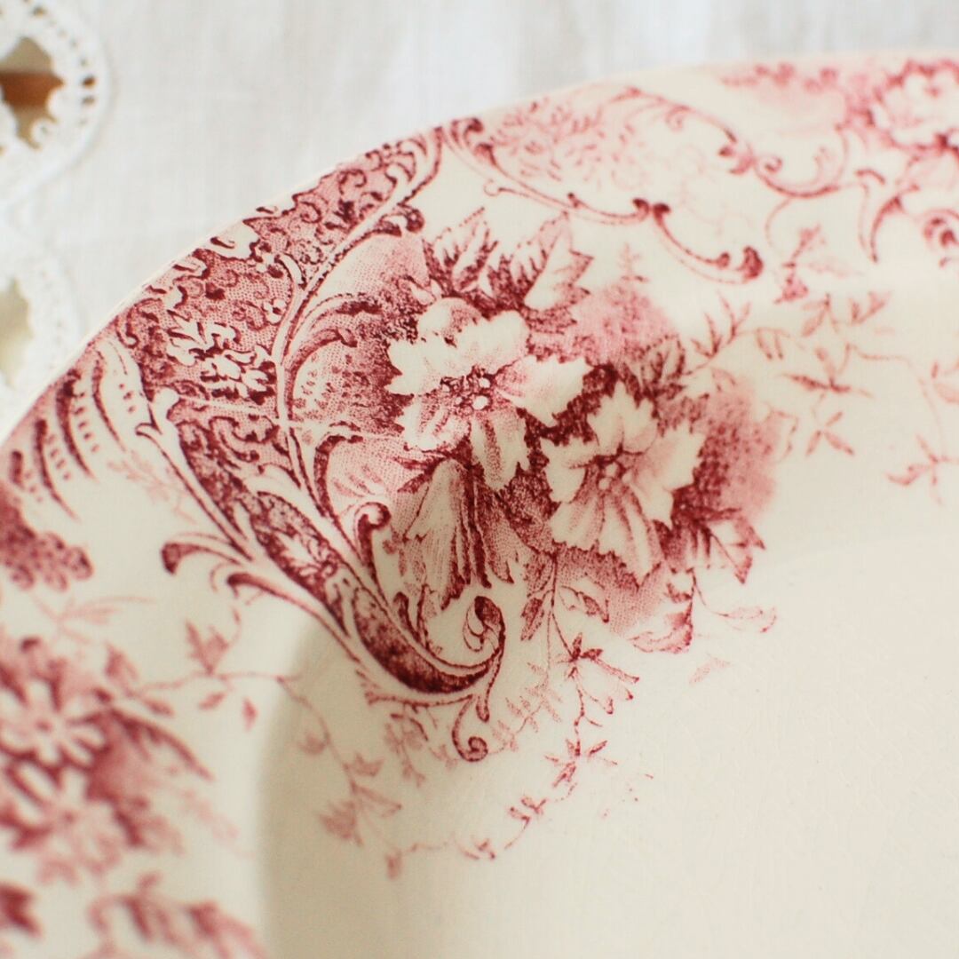 フランスより届きましたChoisy le Roiのアンティーク皿です。深皿の周りにはかすれたような線のタッチが細かな植物やお花、ゴージャスなロカイユがデザインされた大変美しいプレートです。Terre de Fer Hte Boulenger の刻印があるため19 世紀末のものです。