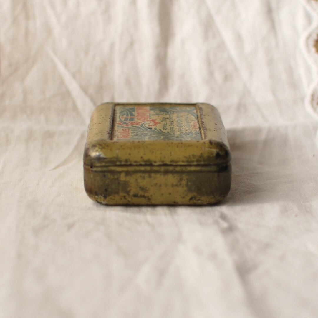 古びた薬が入っていた長方形のTIN缶です。角は丸く蓋は片側が開くタイプのものです。着いた色味、アールヌーボー調の植物の版画の様なデザインや書体がとてもが優雅な印象ですが咳止めドロップが入っていた缶です。ところどころ傷がありますが雰囲気があります。中はさびています。20世紀初頭のものになります。