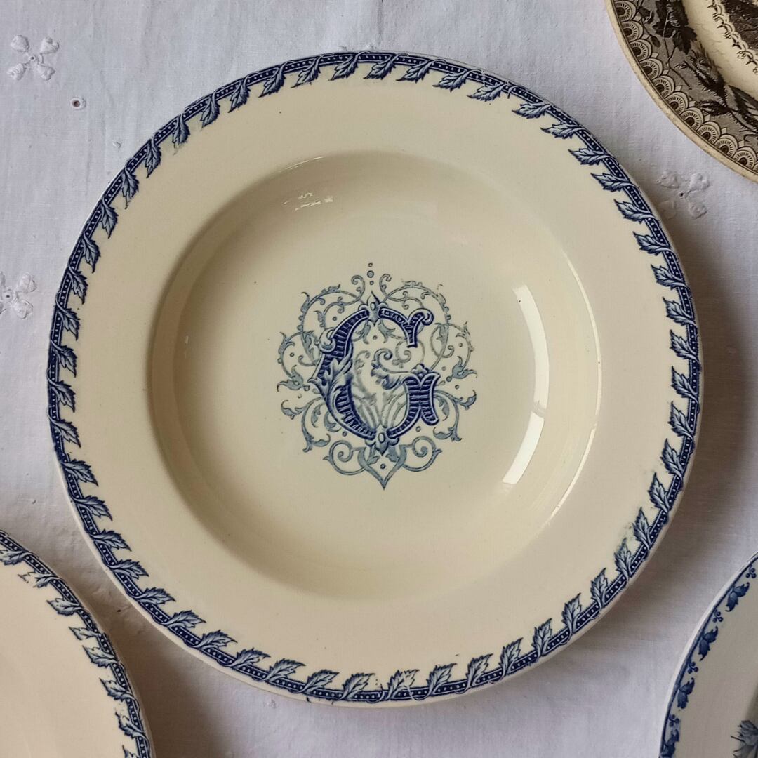 フランスより届きましたK&Gリュネビルのアンティーク皿です。深皿の周りには葉の模様、プレートの中心にはイニシャルのGが入ったシンプルなプレートです。バックスタンプはかすんでおりますが刻印スタンプも入っております。画像を拡大すると小さな点や顔料のにじみがある箇所ございます。