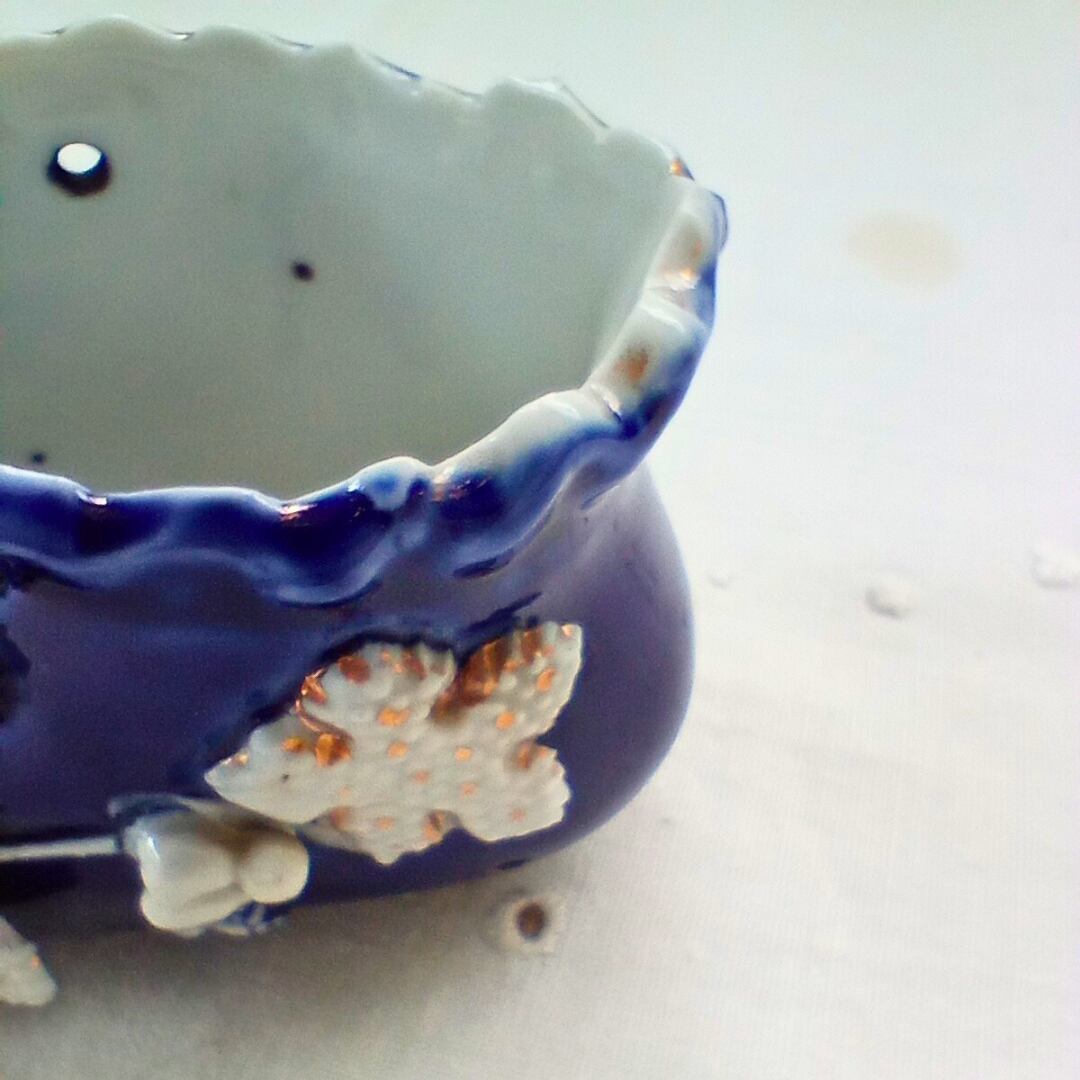 ネイビー(濃紺)に白の細かい細工装飾が施された陶器の靴型をしたVide Poche、鍵などを入れておく小物入れです。植物なども入れて飾ることができます。以前同じシリーズをご紹介いたしましたが、こちらは靴の紐を通す穴が上の方にあいているタイプです。横から見ると男の子?天使?の厚みがすこし薄い感じの仕上がりです。