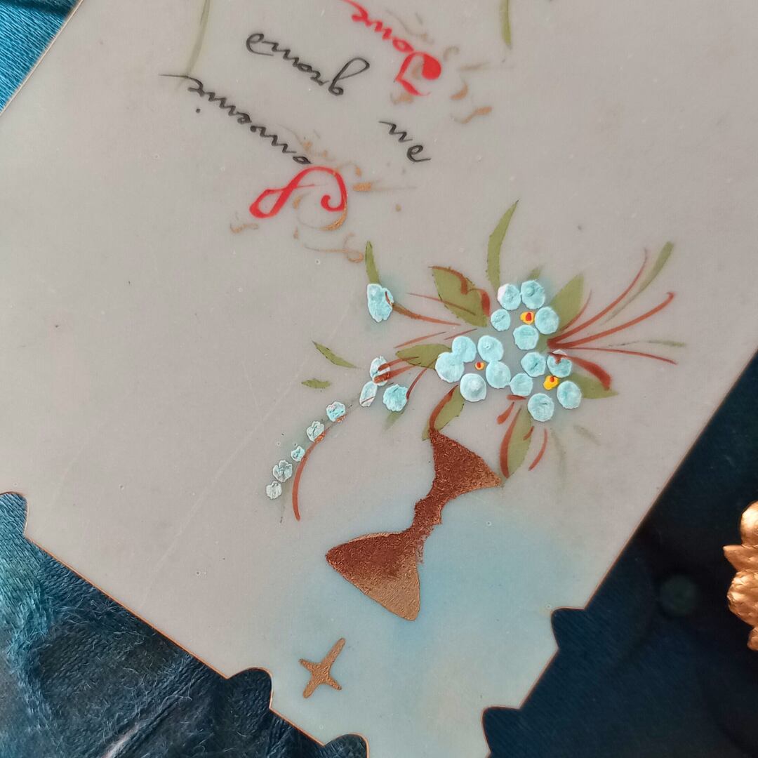 忘れな草とパンジーがデザインされた文字も全て手描きで1900年代初期のものです。
