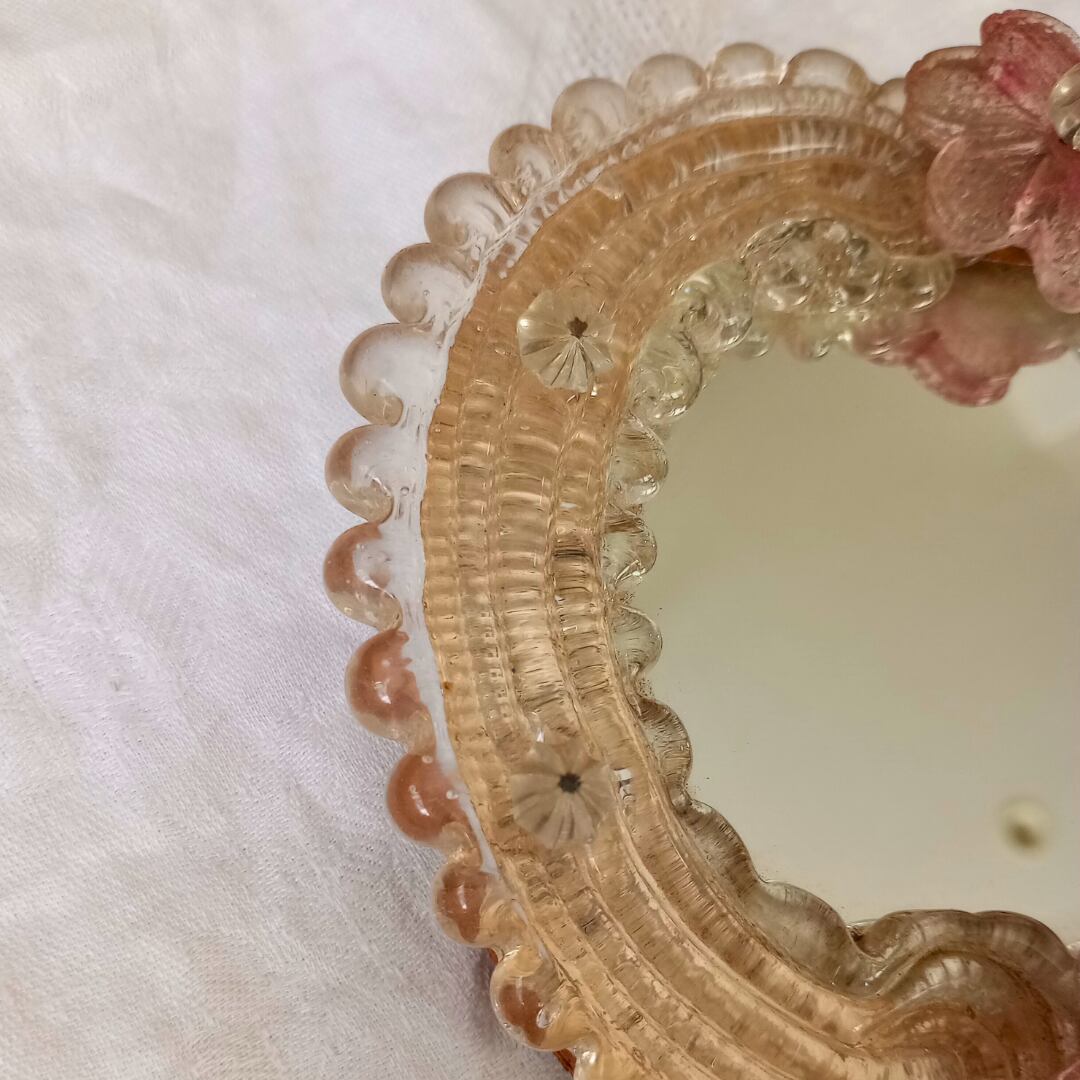 フランスより届きました、卓上と壁掛け両用の小さなヴィンテージ、ムラノガラスミラー(イタリア製)です。波うった粒状のガラスの縁に、淡いピンクの大きなお花が2か所ついたタイプです。ふちどり全体がゴールドの様に見えますが、下地の木の色が透明のガラスから透けて見えてそのような雰囲気に。実際はもう少し透明に近いお色です。幅が16センチと小さめのミラーでとても可愛いサイズです。
