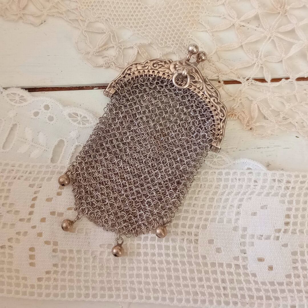フランスより届きました口金のデザインが、ロカイユの中にドラゴン(龍)が隠れたスターリングシルバー925のコインメッシュパースです。下についた6つの粒のビーズも全て揃っておりとてもエレガントです。